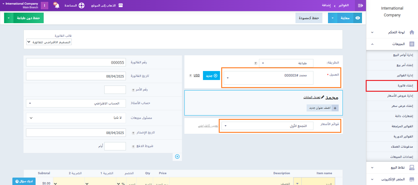 الآن، عند الانتقال إلى شاشة “إنشاء فاتورة” وتحديد العميل الذي تم ربطه مسبقًا بقائمة الأسعار، سيظهر قائمة الأسعار تلقائيًا كما هو موضح أدناه.