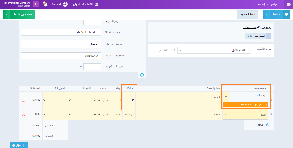 اضف في جدول البنود الخدمة “Delivery“, سيظهر في خانة سعر الوحدة السعر المحدد مسبقا في قائمة الأسعار.