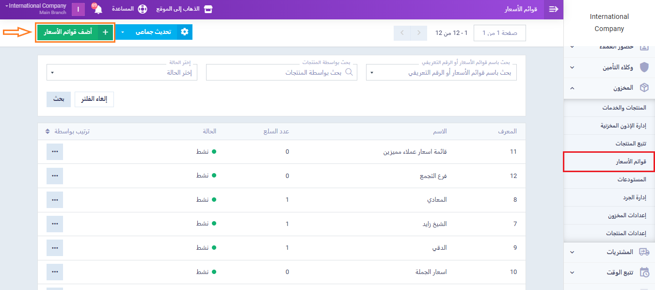 الان توجه الى القائمة الرئيسية مرة اخرى و اضغط على “المخزون“, ثم من القائمة المنسدلة اضغط “قوائم الأسعار“.