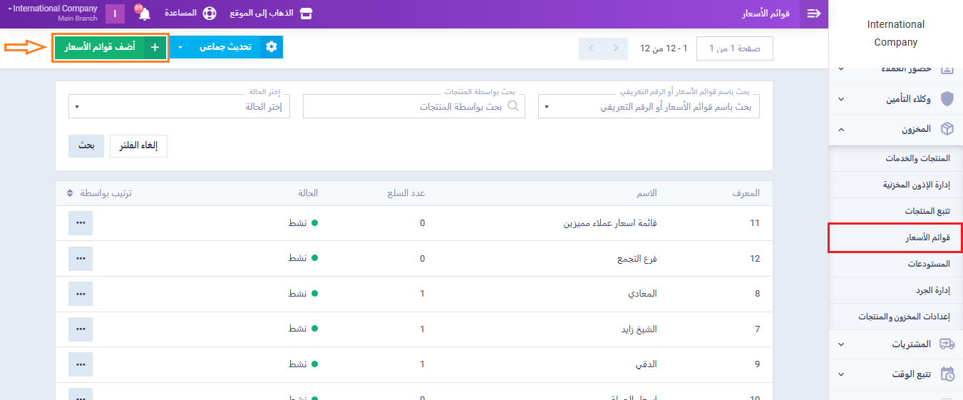 الان توجه الى القائمة الرئيسية مرة اخرى و اضغط على “المخزون“, ثم من القائمة المنسدلة اضغط “قوائم الأسعار“.