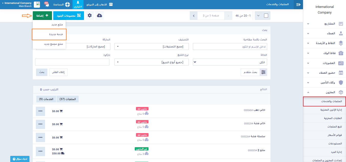 من القائمة الرئيسية اضغط على “المنتجات والخدمات“, ثم اضغط على زر “إضافة” و اختر “خدمة جديدة “.