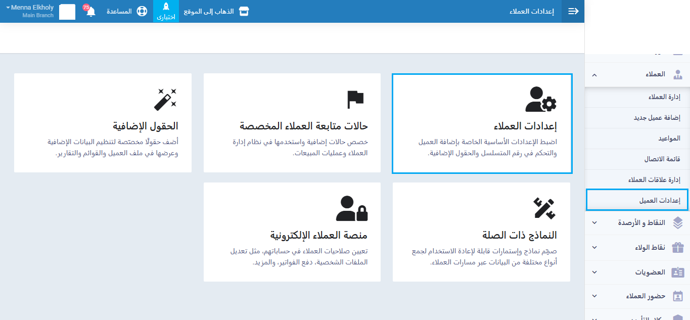 اضغط على “إعدادات العميل” المنسدلة عن “العملاء” بالقائمة الرئيسية ثم اضغط على بطاقة “إعدادات العملاء”.