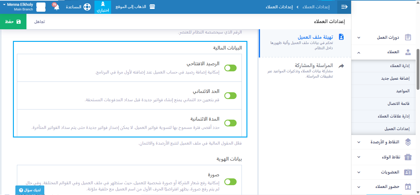 فعّل الحقول المالية في ملف العميل لمتابعة الأرصدة والالتزامات الائتمانية.