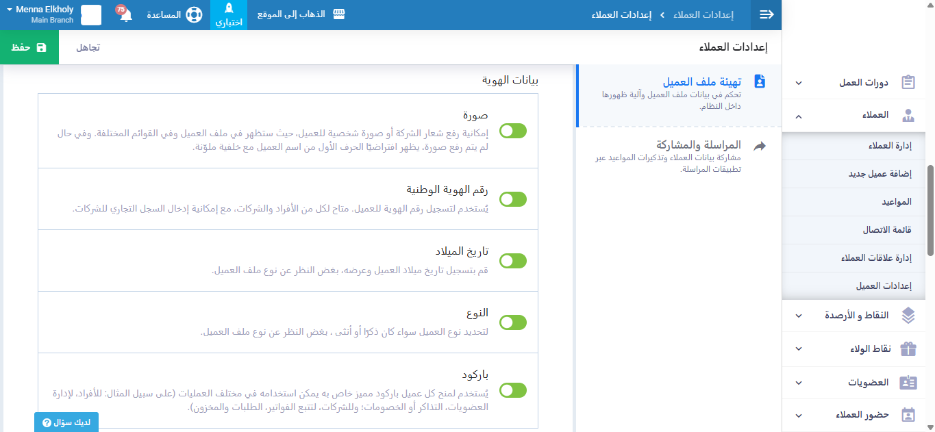 • الباركود: منح كل عميل باركود مميز لاستخدامه في العمليات المختلفة مثل العضويات، الخصومات، أو تتبع المعاملات.