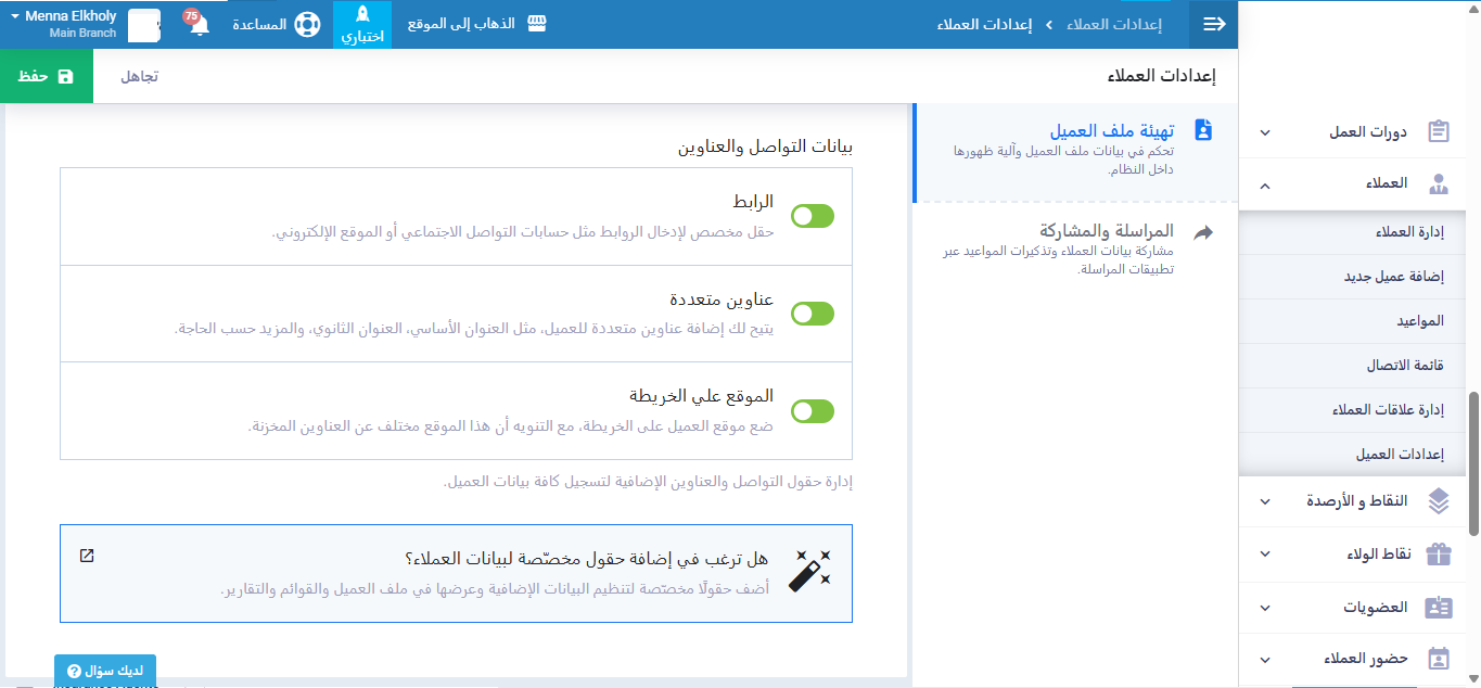يمكنك إضافة حقول مخصّصة لتسجيل بيانات إضافية غير متوفرة افتراضيًا، مع إمكانية عرضها في ملفات العملاء والقوائم والتقارير.