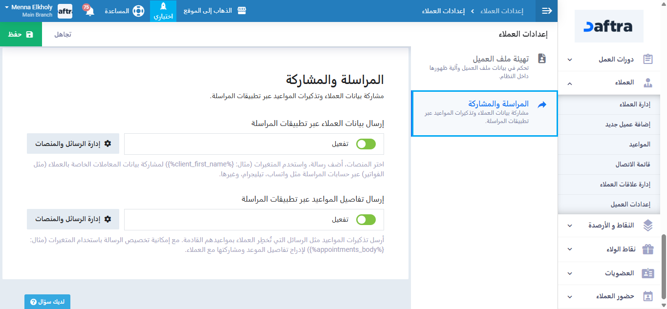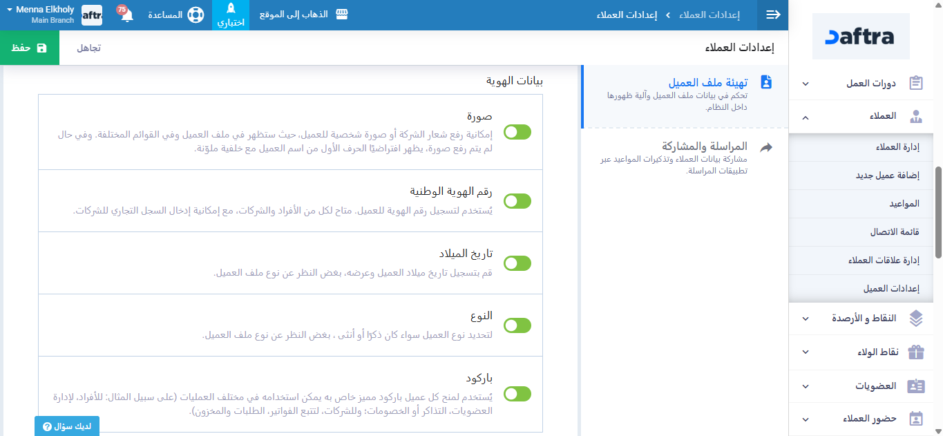 شرح ضبط إعدادات العميل في برنامج إدارة العملاء بدفترة