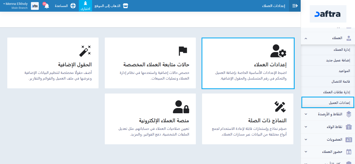 اضغط على “إعدادات العميل” المنسدلة عن “العملاء” بالقائمة الرئيسية ثم اضغط على بطاقة “إعدادات العملاء”.