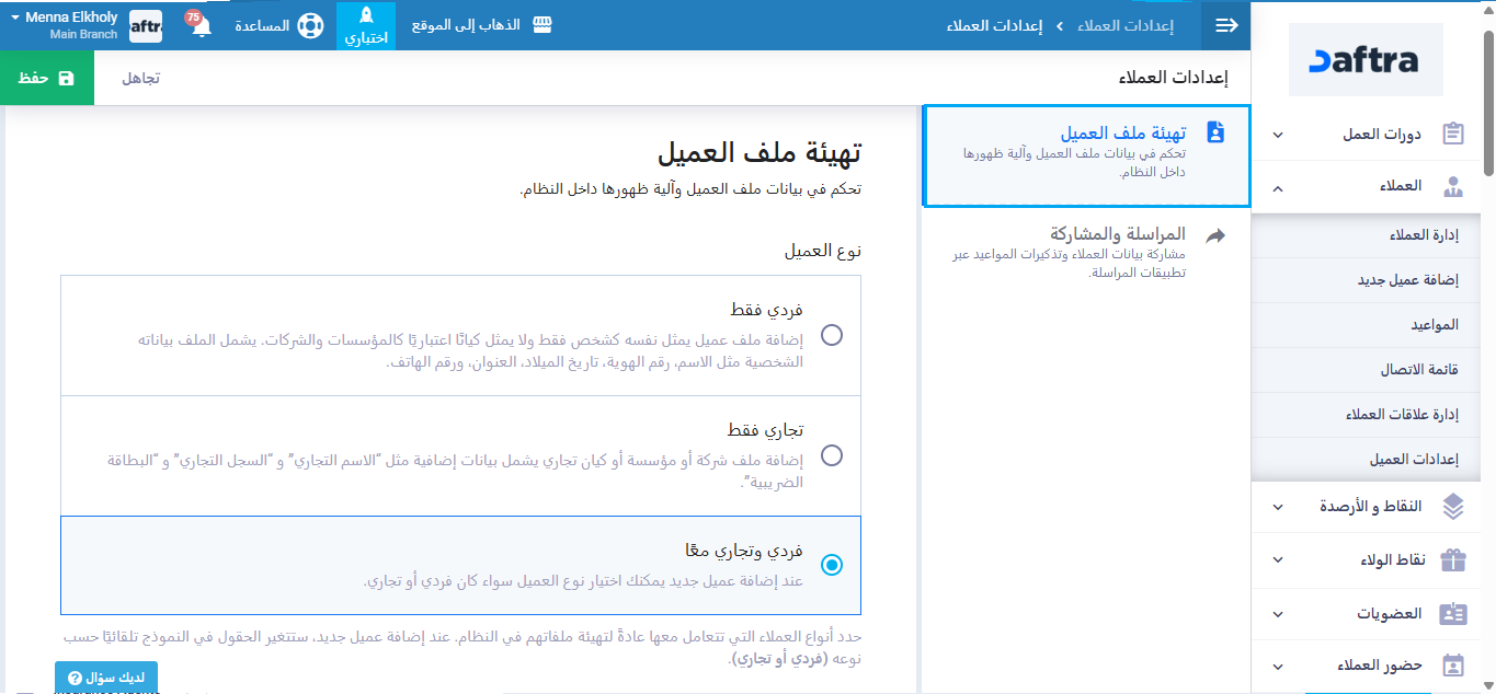 حدد أنواع العملاء التي تتعامل معها ليقوم النظام بعرض الحقول المناسبة تلقائيًا عند إضافة عميل جديد.