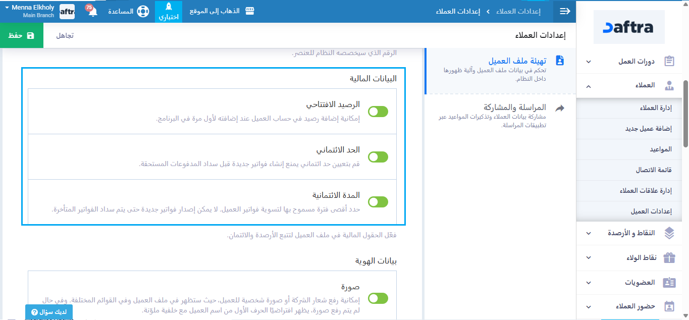 - الصورة: رفع صورة شخصية للعميل أو شعار الشركة، أو عرض الحرف الأول من اسم العميل تلقائيًا في حال عدم الرفع.