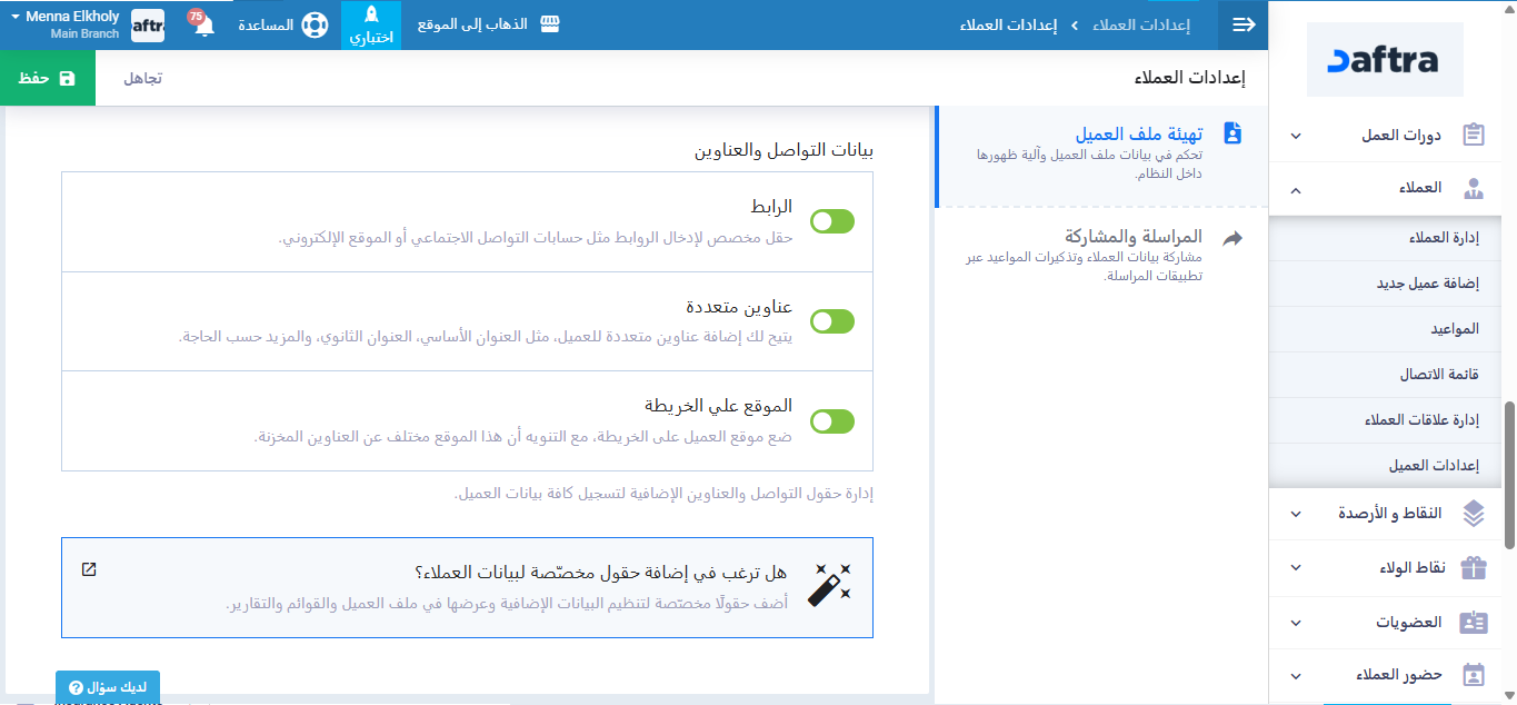 يمكنك إضافة حقول مخصّصة لتسجيل بيانات إضافية غير متوفرة افتراضيًا، مع إمكانية عرضها في ملفات العملاء والقوائم والتقارير.