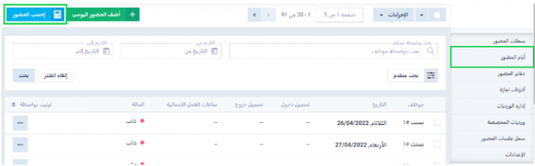 يمكنك احتساب أيام حضور محددة، بالتوجه إلى “أيام الحضور” المنسدلة عن قائمة “الحضور” بالقائمة الرئيسية، ثم اضغط على “احسب الحضور”