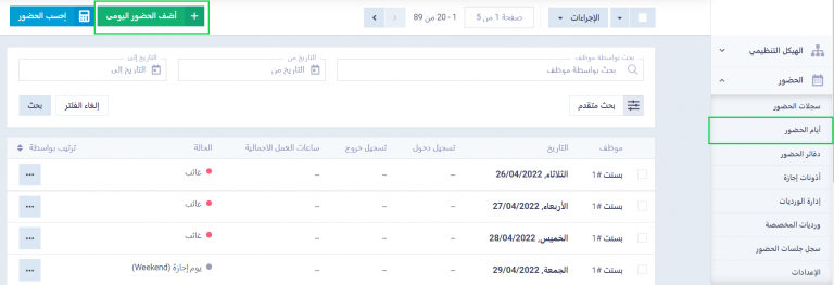يمكنك تسجيل حضور الموظف يدويًا من النظام بشكل يومي، دون الحاجة لربط النظام بماكينة الحضور أو استيراد ملفات تم تجهيزها خارجيًا، كل ما عليك أن تتوجه إلى “أيام الحضور” المنسدلة عن “الحضور” بالقائمة الرئيسية، واضغط على زر “أضف الحضور اليومي”.