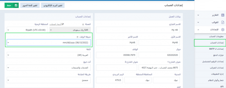 حيث يراعى مطابقة البيانات كلها للصيغة الموضحة في الصورة السابقة وبالتحديد صيغة التاريخ، ويمكنك التحكم في صيغة التاريخ بالبرنامج من خلال “إعدادات الحساب” المنسدلة عن “الإعدادات” بالقائمة الرئيسية.