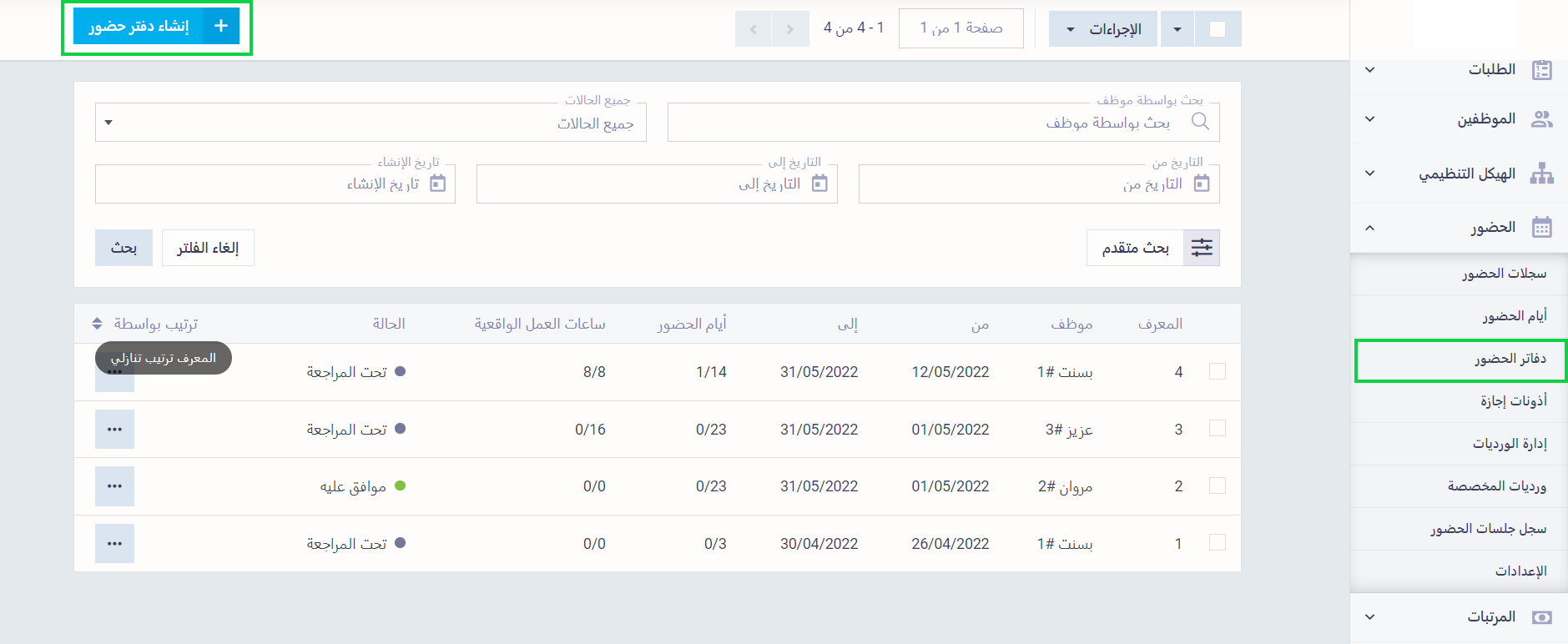 لإضافة دفتر جديد، اضغط على “دفاتر الحضور” المنسدلة عن “الحضور” من القائمة الرئيسية، ثم اضغط على زر “إنشاء دفتر حضور”