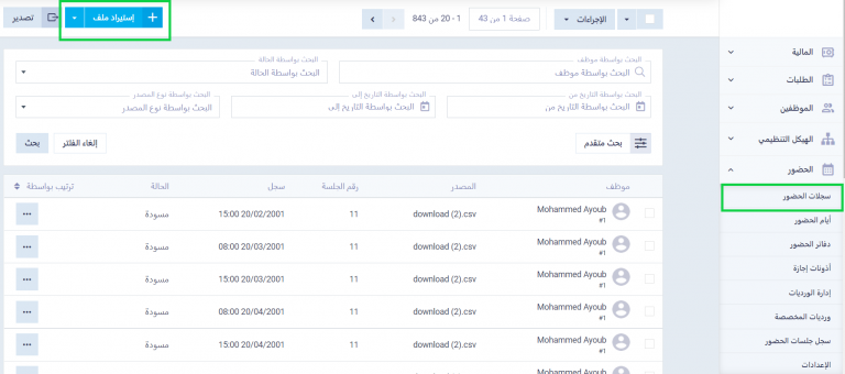 لاستيراد ملف الحضور من جهازك، اضغط على “سجلات الحضور” المنسدلة عن قائمة “الحضور” بالقائمة الرئيسية، ثم اضغط على زر “استيراد ملف”