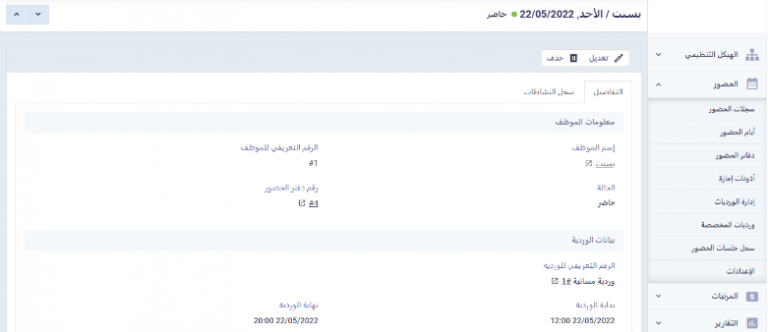 بالضغط على يوم الحضور المراد عرض تفاصيله، تظهر تفاصيل تخص هذا اليوم فقط، كحالة الحضور، والوردية التي ينتمي لها الموظف وكذلك ميعاد حضور وانصراف الموظف الفعلي.