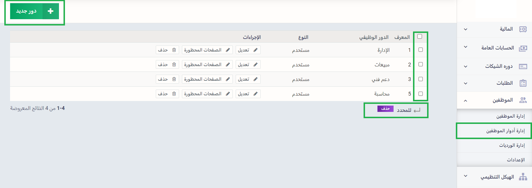 ولإضافة دور وظيفي جديد اضغط على “أدوار الموظفين” المنسدلة عن “الموظفين” بالقائمة الرئيسية، واضغط على “دور جديد”.
