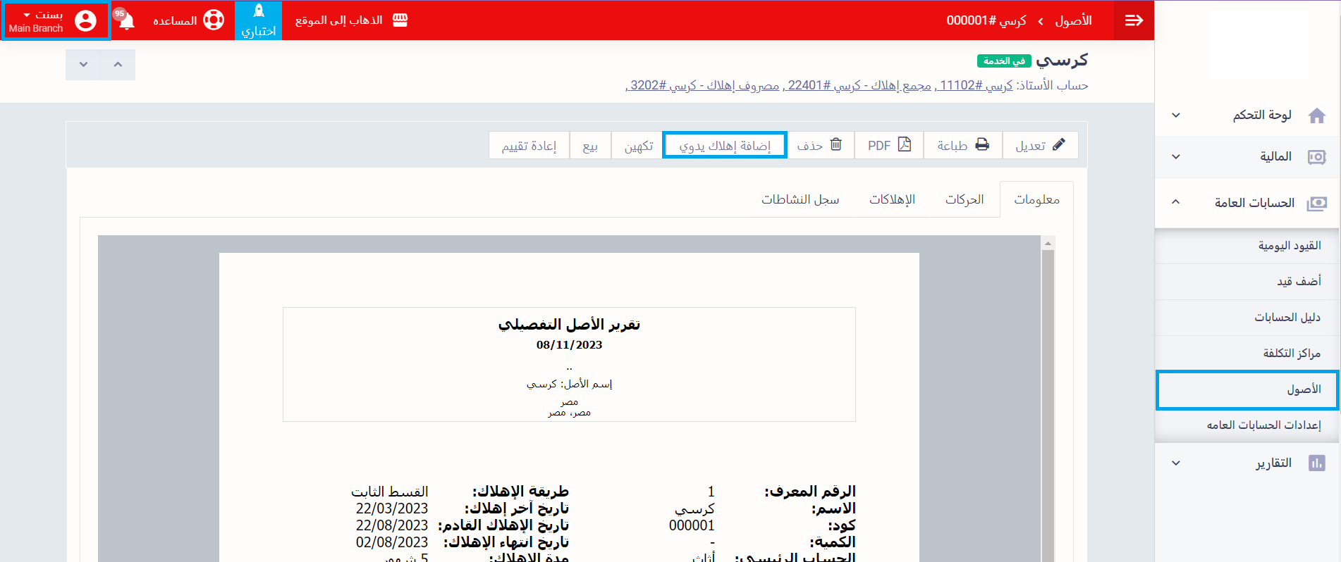 واضغط على أي أصل لديك واضغط على “إضافة إهلاك يدوي”.