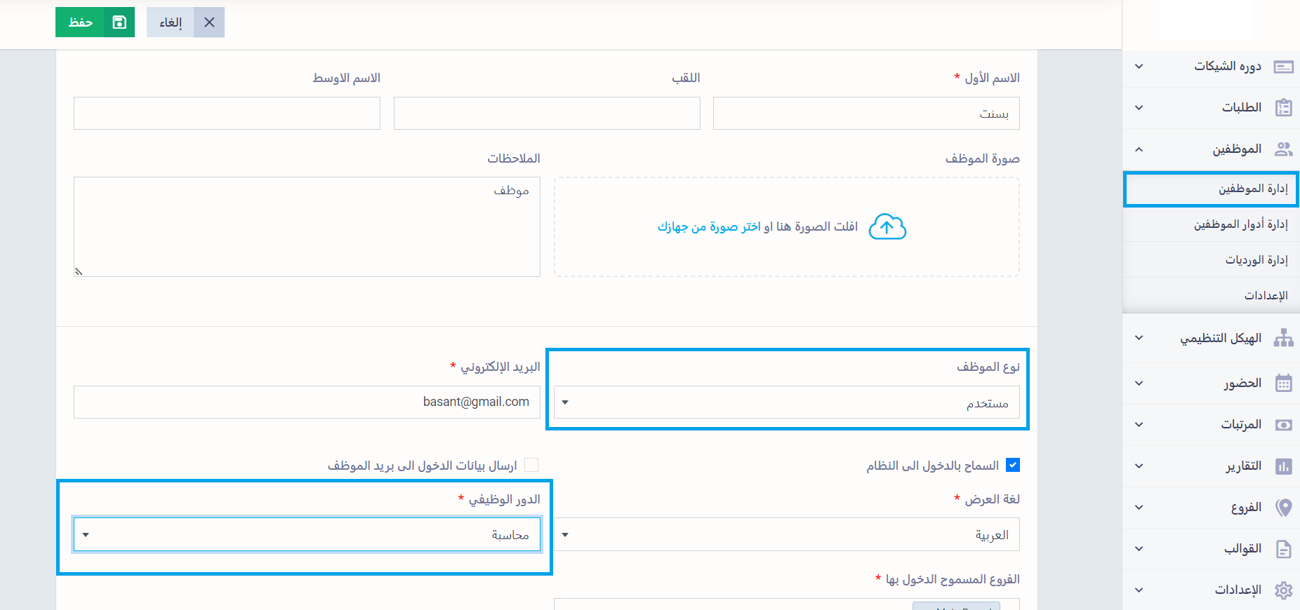 اضغط على “إدارة الموظفين” المنسدلة عن “الموظفين” بالقائمة الرئيسية واضغط على الموظف المراد تعيين الدور الوظيفي له،