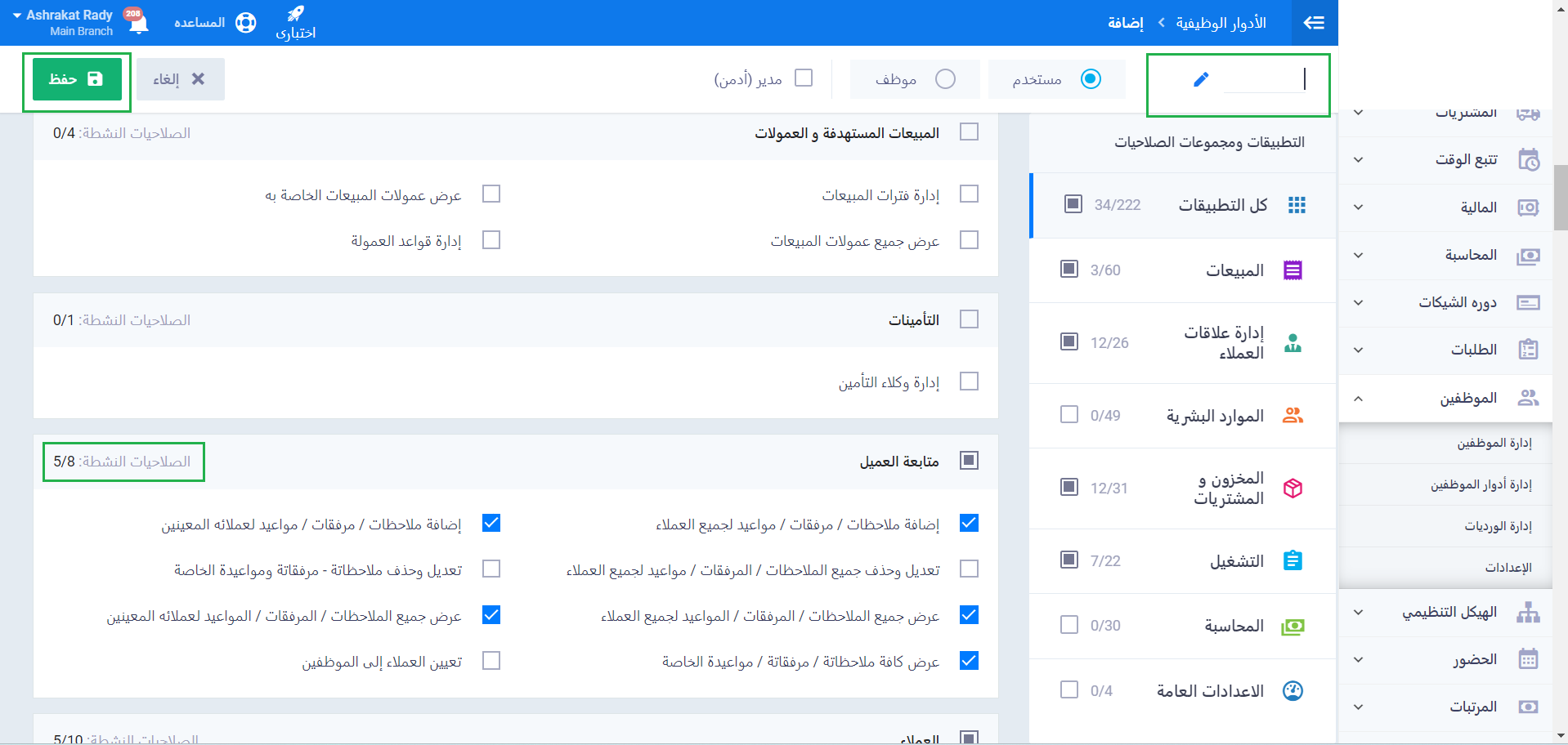 عند اختيار نوع الدور الوظيفي “موظف” تظهر لك بعض الصلاحيات مثل: