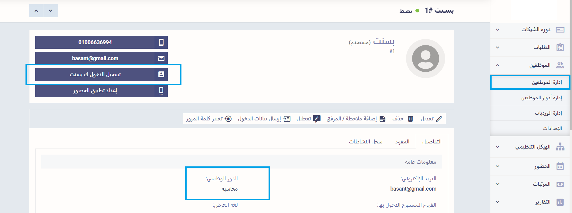 اضغط على “إدارة الموظفين” المنسدلة عن “الموظفين” بالقائمة الرئيسية، واضغط على المستخدم لاستعراض ملفه الشخصي، ثم ادخل على “تسجيل الدخول كـ + اسم المستخدم”
