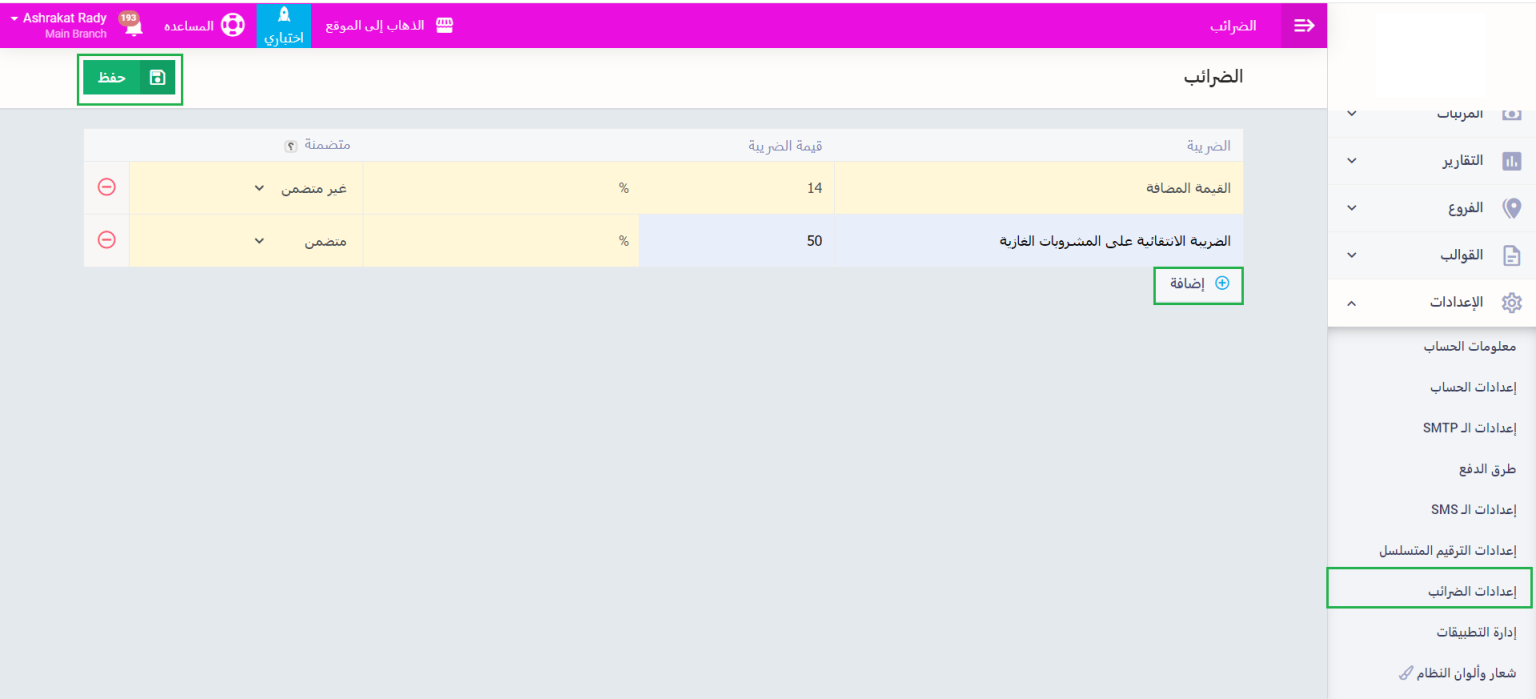 يمكنك إضافة أنواع الضرائب المراد احتسابها بسهولة على دفترة من خلال التوجه إلى “إعدادات الضرائب” المنسدلة عن “الإعدادات” بالقائمة الرئيسية