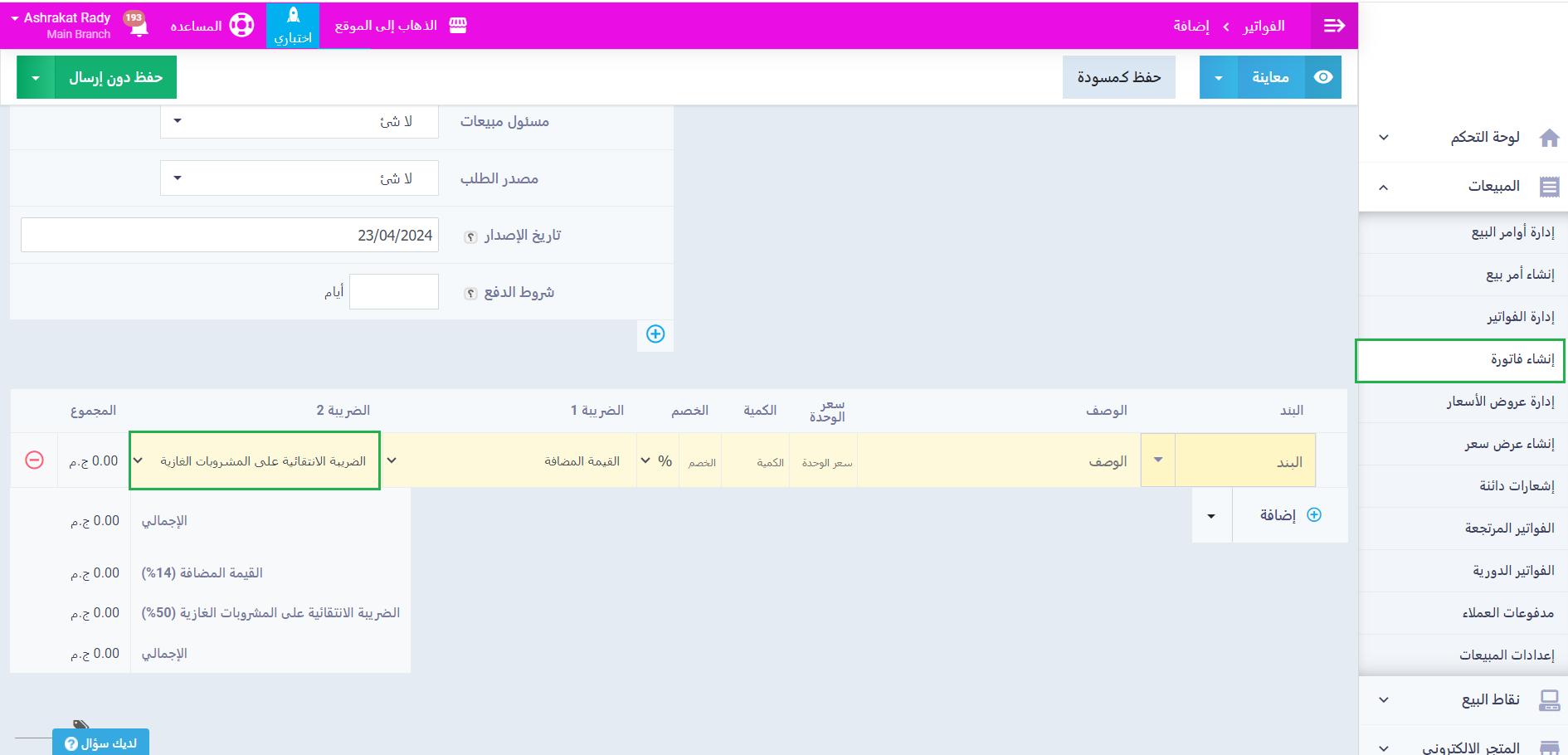 تظهر لك الضريبة الجديدة عند اختيار نوع الضريبة المطبقة على المنتج أو الخدمة داخل الفواتير كما يظهر في الشاشة التالية