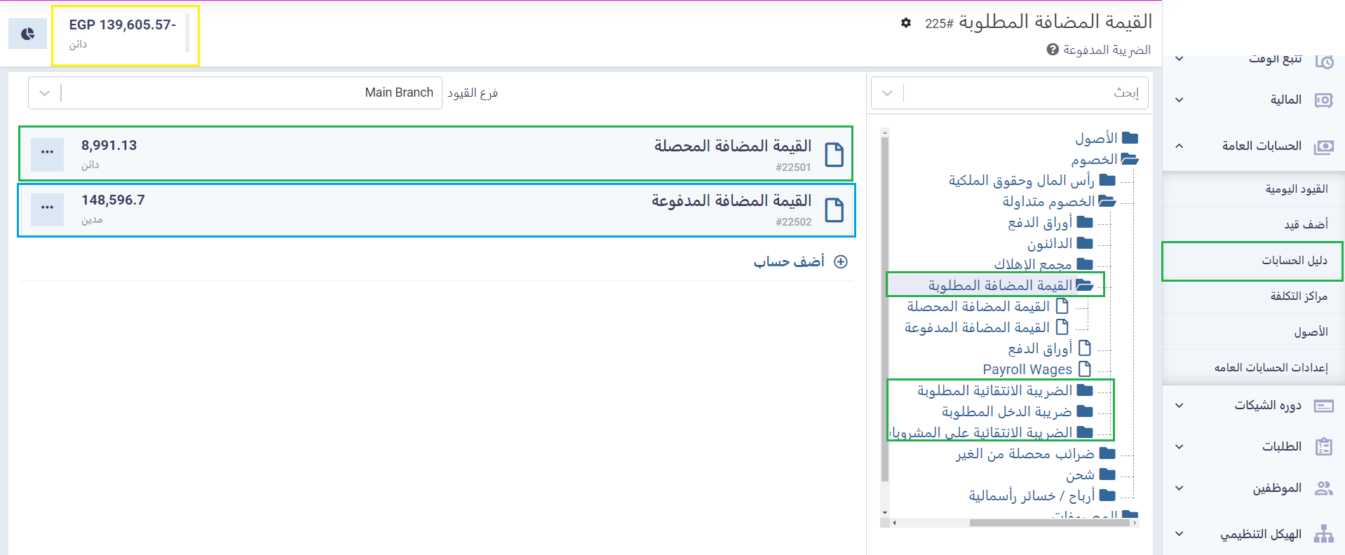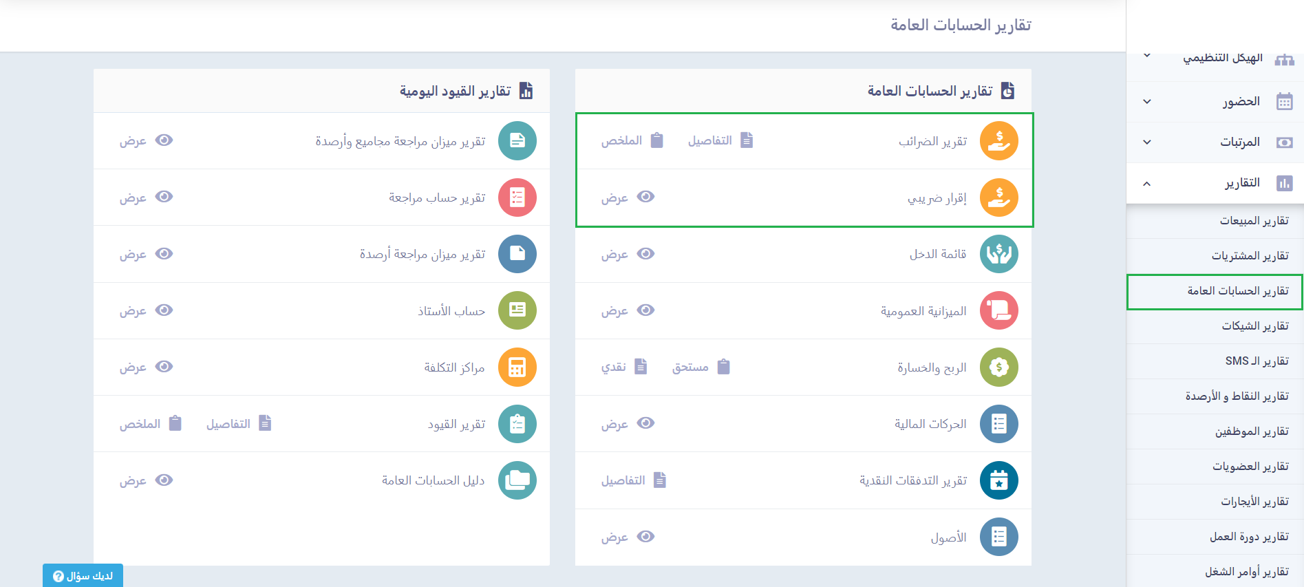 لاستعراض التقارير المتعلقة بالضرائب، اضغط على “تقارير الحسابات العامة” المنسدلة عن “التقارير” بالقائمة الرئيسية لتجد كل من تقرير الضرائب والإقرار الضريبى، استعرض ما توده منهم واضبط الإعدادات الخاصة به وقم بتحميله.