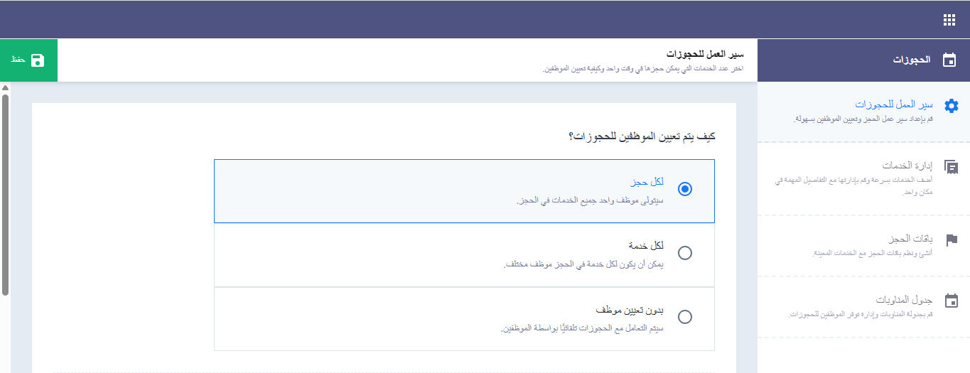 ستتعرف فيما يلي على طرق تعيين الموظفين للحجوزات، وكيفية التحكم بعدد الخدمات المسموح بها في كل حجز. هذه الإعدادات تمنحك القدرة على تخصيص تجربة الحجز بما يتناسب مع حجم المنشأة، نوع الخدمات، وكفاءة فريق العمل، لتضمن سير العمل بشكل منظم.