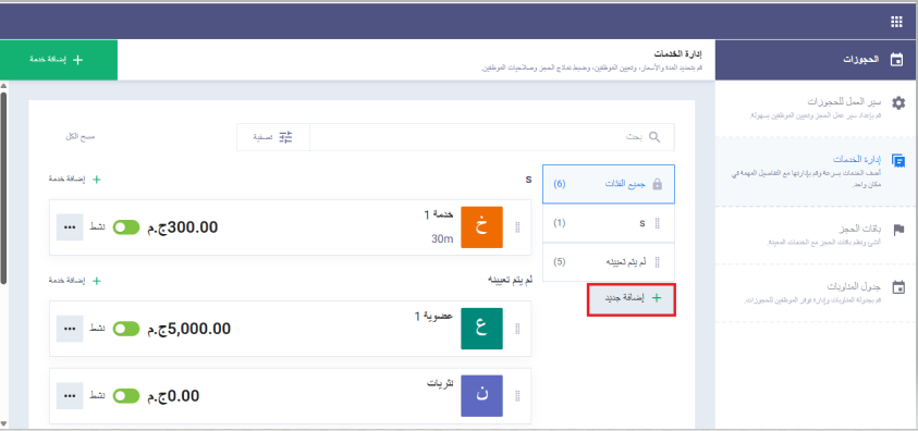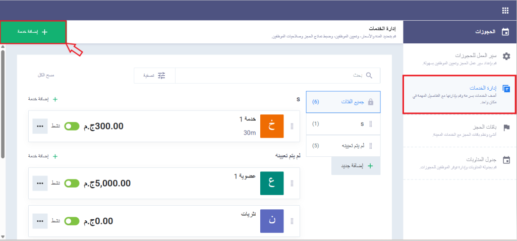 يتيح لك قسم إدارة الخدمات في نظام الحجوزات من دفترة إمكانية إضافة الخدمات المختلفة التي تقدمها منشأتك، وتعيين أسعارها، ومدة تنفيذها، والموظفين المسؤولين عنها.