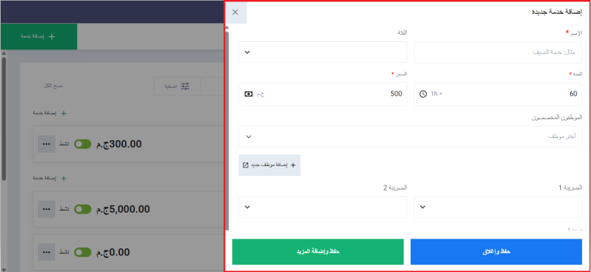- حفظ وإغلاق: لإنهاء إضافة الخدمة والعودة إلى قائمة الخدمات.