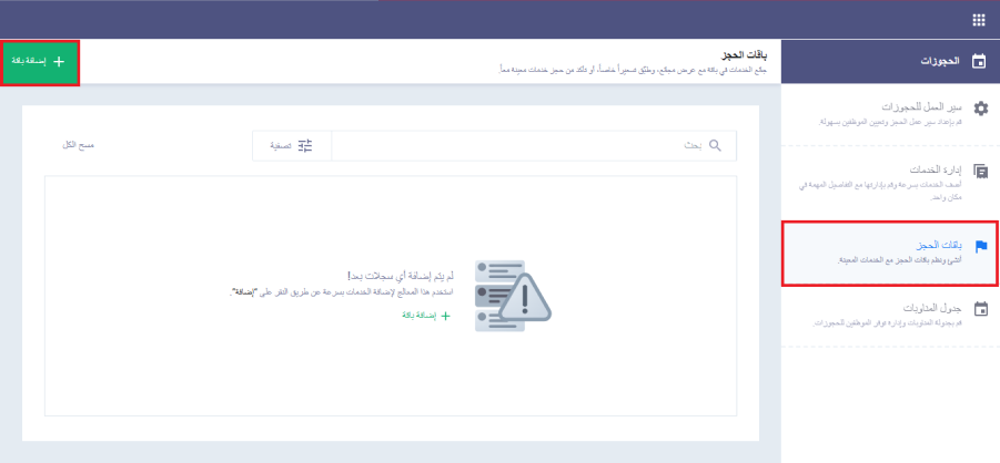 لإنشاء باقة جديدة، انتقل إلى قسم “باقات الحجز”، ثم اضغك على زر “إضافة باقة”.