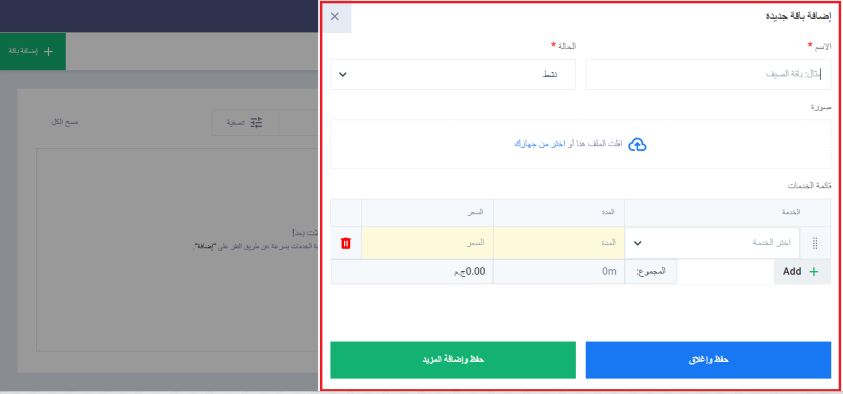يمكنك إضافة خدمات أكثر داخل الباقة، اضغط على زر “إضافة” الموجود أسفل قائمة الخدمات، وسيتم فتح صف جديد لملء بيانات خدمة أخرى بنفس الحقول السابقة.
