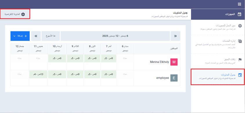 لضبط الوردية الافتراضية للموظفين، اتبع هذه الخطوات: