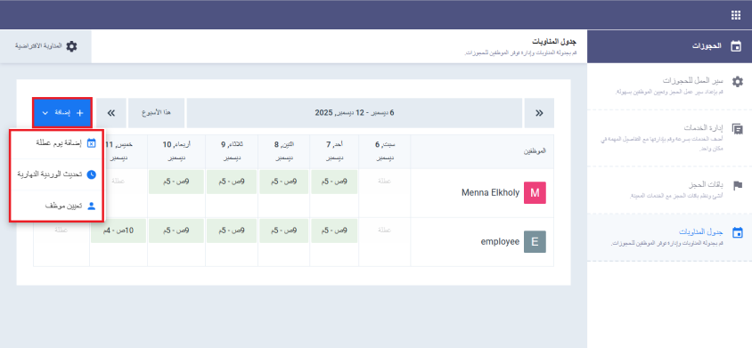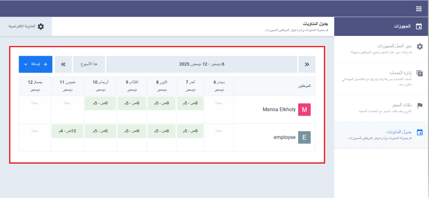 - المناوبات: تعرض أوقات العمل لكل موظف في كل يوم.