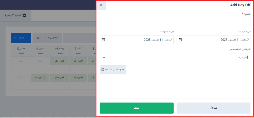 لتحديد أيام العطل الرسمية أو الخاصة للموظفين، قم بملء البيانات التالية: