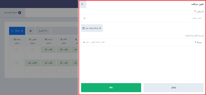 - الموظفون:اختر موظفًا من القائمة، أو اضغط إضافة موظف جديد لإنشاء ملف موظف جديد مباشرة.
