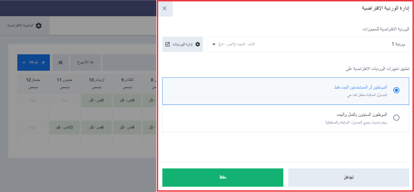 - من قسم “تطبيق تغييرات الورديات الافتراضية على” اختر أحد الخيارات التالية: