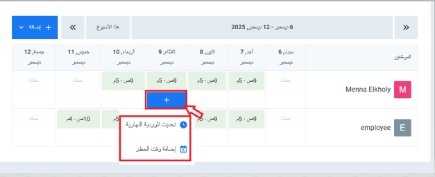 يمكنك نظام المناوبات أيضًا من تحديث الوردية النهارية أو إضافة وقت حظر لمنع الحجز في أوقات محددة، وذلك من خلال الضغط على زر “+” الموجود في منتصف اليوم الذي تريد تعديله. بعد الضغط، ستظهر لك قائمة تحتوي على خيارين رئيسيين: