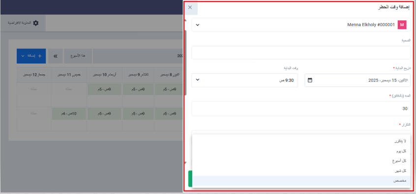- التسمية: يمكنك كتابة سبب الحظر مثل (اجتماع فريق – صيانة – انشغال داخلي).