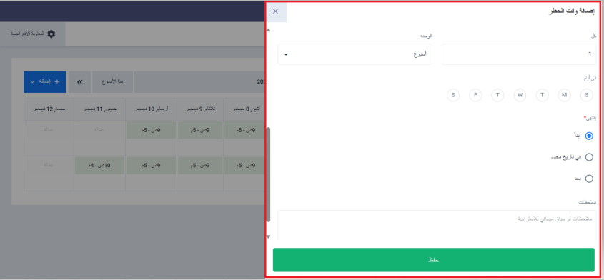 - ملاحظات: يتيح لك هذا الحقل إضافة أي تفاصيل أو توضيحات إضافية تتعلق بوقت الحظر.