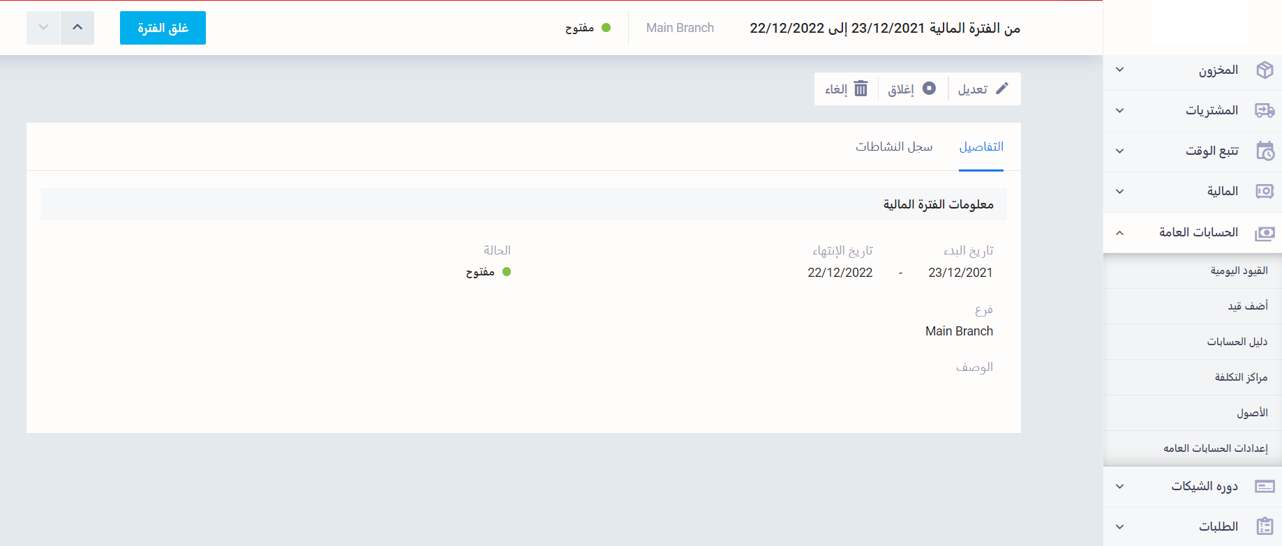 ويمكنك التحكم في الفترة المالية المحاسبية من “إعدادات الحسابات العامة” المنسدلة عن “الحسابات العامة” بالقائمة الرئيسية.
