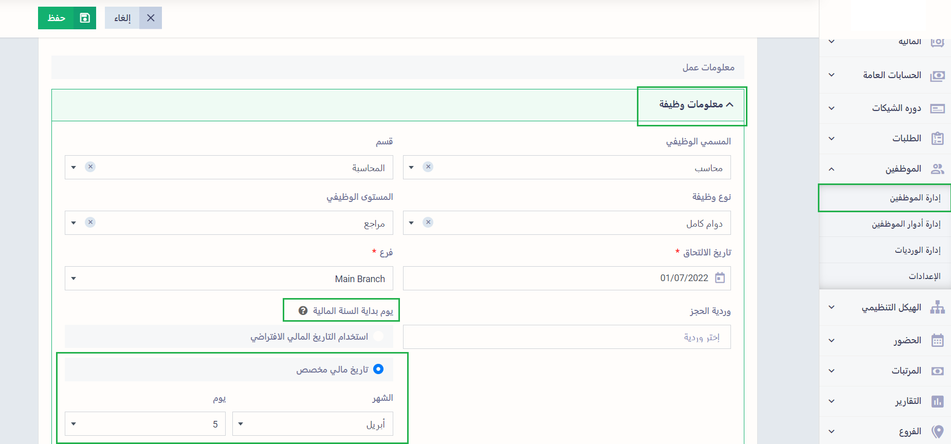 حدد تاريخ بداية السنة المالية للموظفين ثم اضغط “حفظ”.