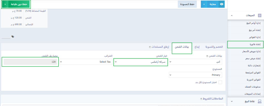 اضغط على “إنشاء فاتورة” المنسدلة عن “المبيعات” بالقائمة الرئيسية وتوجه إلى قسم “بيانات الشحن” واختر شركة الشحن المرادة من القائمة المنسدلة عن حقل “خيارات الشحن” لتظهر لك مصاريف الشحن المقررة تلقائيًا، استكمل بيانات الفاتورة واضغط على زر “حفظ”.