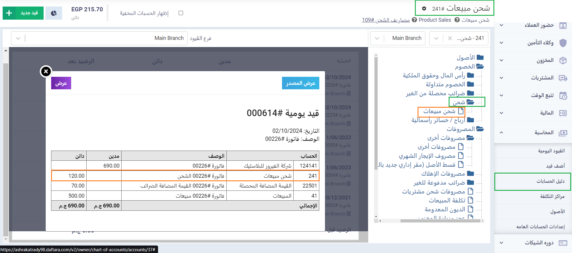 لتجد القيد في دليل الحسابات وقد تم توجيه مبلغ الشحن بالكامل إلى حساب شحن المبيعات.