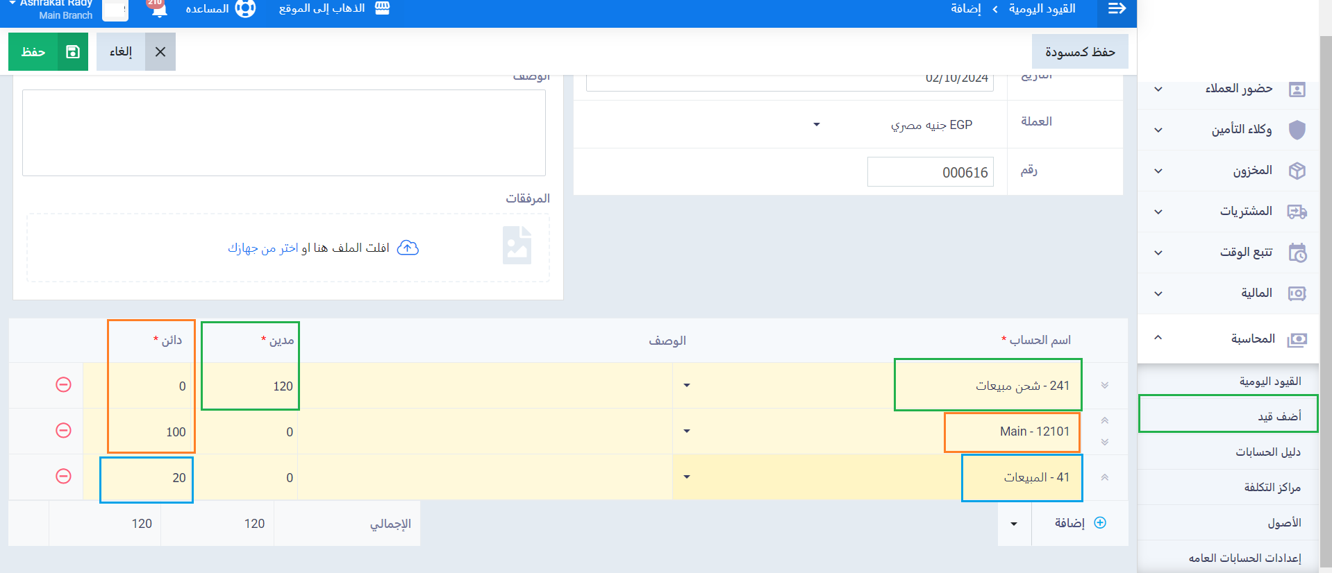 اضغط على “أضف قيد” المنسدلة عن “المحاسبة” بالقائمة الرئيسية ثم قم بإدخال القيد كالتالي: