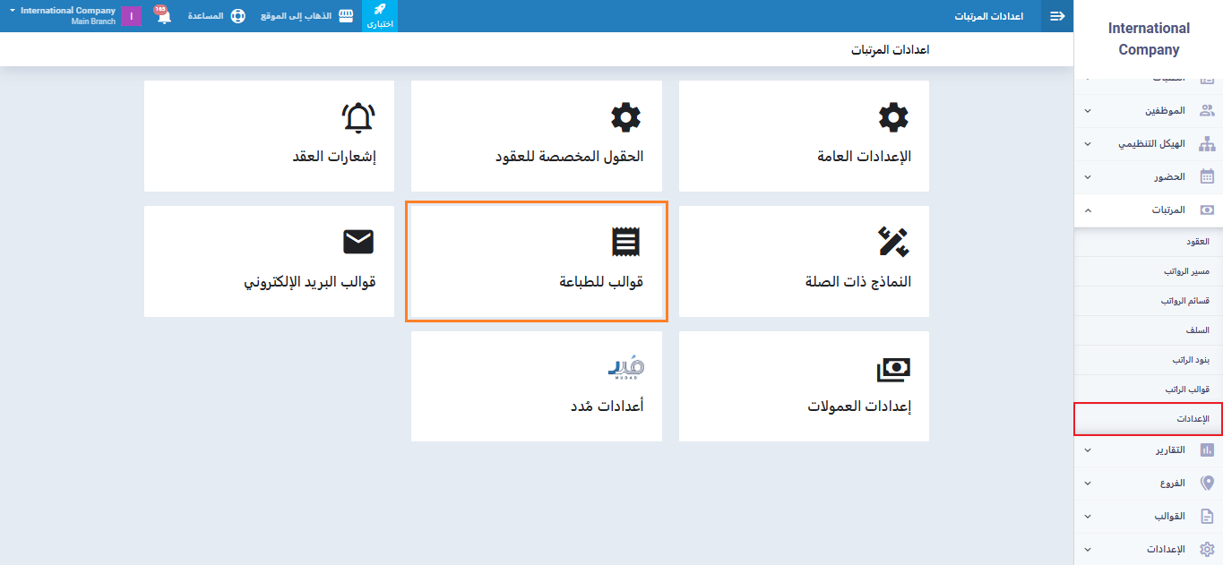 من القائمة الرئيسية، اضغط على “الإعدادات” في القائمة المنسدلة لـ “المرتبات“، ثم اختر “قوالب للطباعة“.
