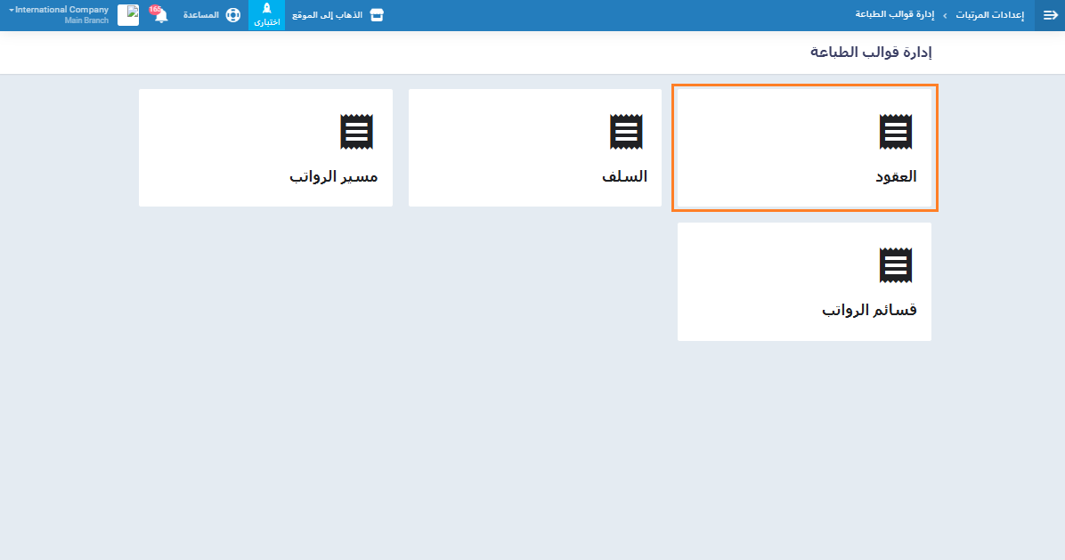 من شاشة إدارة قوالب الطباعة، اختر بين (العقود – مسير الرواتب – قسائم الرواتب).