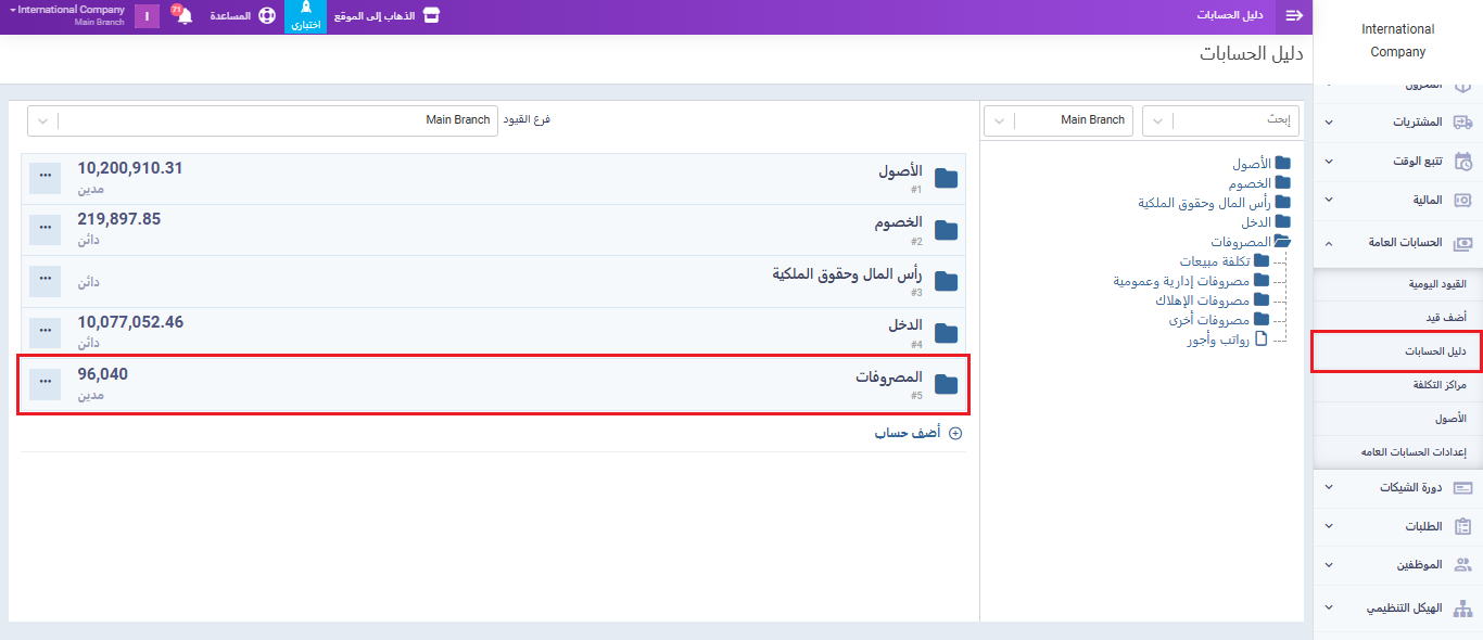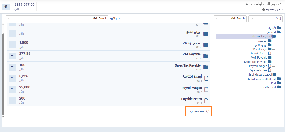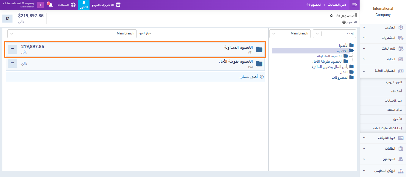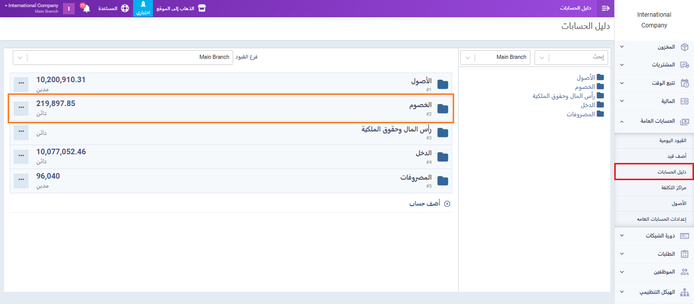 من القائمة الرئيسية، انتقل إلى “الحسابات العامة” ثم اختر “دليل الحسابات” و انتقل إلى “الخصوم“.