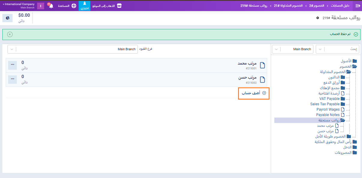 داخل هذا الحساب، أضف الحسابات الفرعية الخاصة بكل موظف مثل: “مرتب محمد” و “مرتب حسن” بالضغط على “أضف حساب” كما في المثال بالصورة.